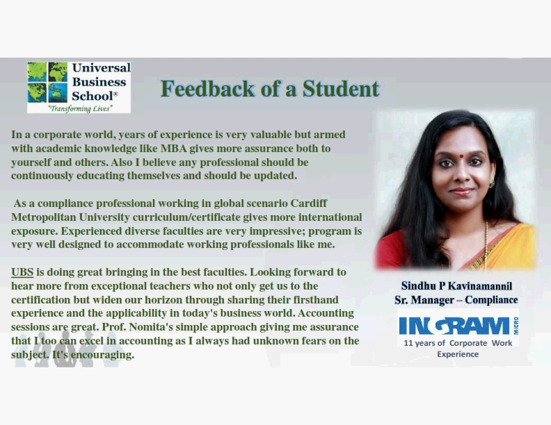 At Universal Business School, we follow the Experiential Learning Waterfall which optimises the learning process towards 80% practical learning. Each course is embedded with global immersion programs at Cardiff, Industry CEO Workshops, research projects, Economic review sessions, Quizzes, Conferences and Symposiums. These methods ensure student’s ability to grasp complex concepts, put them in practice, develop learning agility and ensure the business fundamentals are engrained in them.